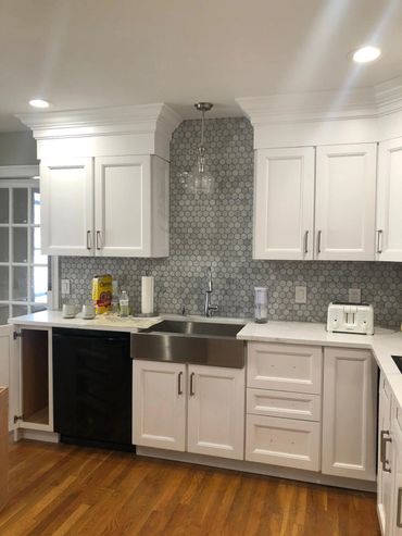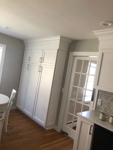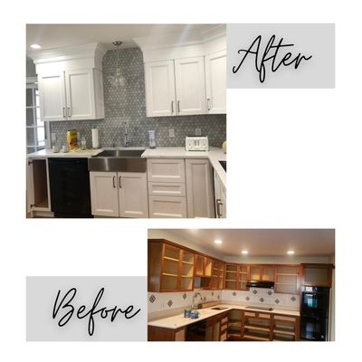 Kitchen cabinet door renovation. The main objective of the kitchen remodel was to modernize and illuminate the space. We are very happy with the results. Removed old doors and manufacturing new doors. The new doors were made of solid wood maple with a base a modern and traditional style.